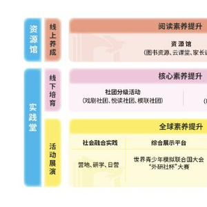 创新型OMO模式:线上资源馆,助力学习习惯养成;线下实践堂,聚焦核心素养培育;通过社团分级活动、体系类课程、社会融合实践、综合展示平台、课程研究交互的方式,使孩子具备个人提升和社会发展需要的必备品格和关键能力。