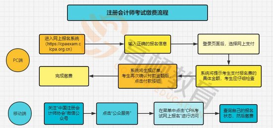 2、缴费流程:2024年注会考试有电脑端和手机端两种缴费方式,具体的缴费流程,大家可以参考下图: