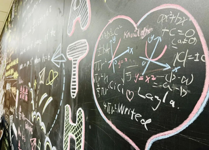 “北京大学数学学院有个咖啡厅,一面墙上全部是老师和学生探讨问题时随手写下的数学公式,有新的人进来看到了,也会在墙上写下自己的解法。”受此启发,辛玲校长在“数学圈”教室布置了两个黑板墙和一个移动白板,现在黑板上到处可看到师生们留下的公式、例题、作业,逐渐显露出一个数学天地的雏形。
