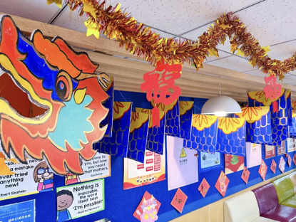 数学作为一个基础学科,和每个学科几乎都要产生关联,在物理、计算机、艺术、设计甚至人文社科中都能发现数学的影子。走在新府学的教学楼里,几乎没有买来的装饰,所有的呈现都是跨学科的学习过程和成果。大到中国年的许愿树、圣诞节的圣诞树,小到感恩节的英文祝福卡、中文月的甲骨文书法,都在各处呈现。艺术创作也需要数学思维,为了迎接即将到来的龙年,学生们在老师们指导下,经过精确计算,测量了空间大小和材料弯曲度,手工制作了两条长龙,也悬挂在楼道最显眼的位置。