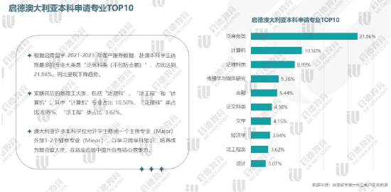 2021-2023年客户服务数据显示,赴澳本科学生选择最多的专业大类是“泛商科类(不包括金融)”(21.86%),紧随其后的是理工大类,包括“计算机”(10.50%)、“泛理科”(8.99%)、“泛工程”(3.62%)。赴澳硕士学生申请占比最高的是“计算机”(13.43%),其次是“金融”(12.07%)。