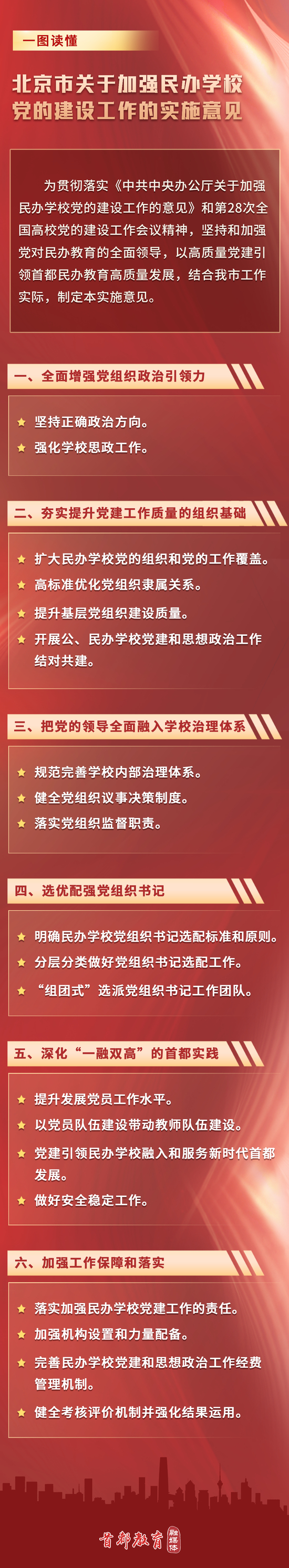 会议强调,民办学校是首都教育事业的重要组成部分,要认真落实党中央部署要求,以高质量党建引领首都民办教育高质量发展。要坚持以习近平新时代中国特色社会主义思想铸魂育人,把党的领导落实到办学治校全过程各方面,抓好立德树人根本任务。以首善标准落实各项任务,选好配强党组织书记,“组团式”选派好党建思政工作力量,深入推进基层党组织标准化、规范化建设。实施好公办民办高校党建思政结对共建工作,着力提升民办高校思政工作水平。严格落实意识形态工作责任制,确保校园安全稳定。压紧压实责任,各级党委切实履行党建工作主体责任,相关部门各司其职、齐抓共管,确保民办学校按照党的要求办学立校、教书育人。