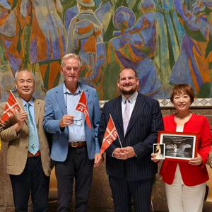 左二是安徒生教师奖组委会主席、安徒生奖及安徒生文学奖发起人本尼·尼博(Benny Nybo)先生,左三是欧登塞市副市长安德斯先生,左一是安徒生教师奖联合发起人董瑞祥先生,左四是小雨姐姐