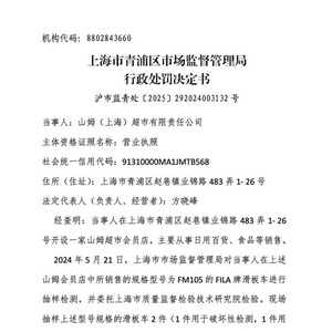 中新网10月17日电(吴家驹)上海市市场监督管理局网站显示,近日,山姆(上海)超市有限责任公司因销售不合格FILA牌滑板车、兰精天丝儿童三件套,分别被上海市青浦区市场监督管理局罚没0.8万余元、1.1万余元。