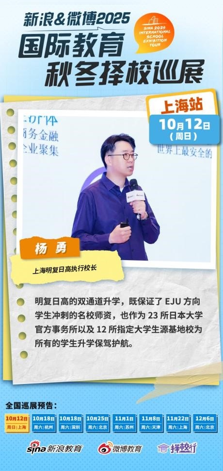 上海国际学校2026年的春季招生已提前拉开帷幕。随着越来越多家庭考虑转轨国际教育或寻求转学插班机会,相关需求持续升温。部分学校甚至在正式启动春招之前,名额就已被家长早早锁定。在此背景下,由新浪教育、微博教育、择校行联合主办的“新浪&微博2025国际教育秋季择校巡展”首场活动于上海成功举办。活动吸引了上千个家庭亲临现场,了解最新国际教育规划与升学策略。众多资深升学专家、知名校长齐聚一堂,为家长解析多元教育路径,探讨教育的更多可能性。活动现场,上海明复日高执行校长杨勇接受了新浪的采访。