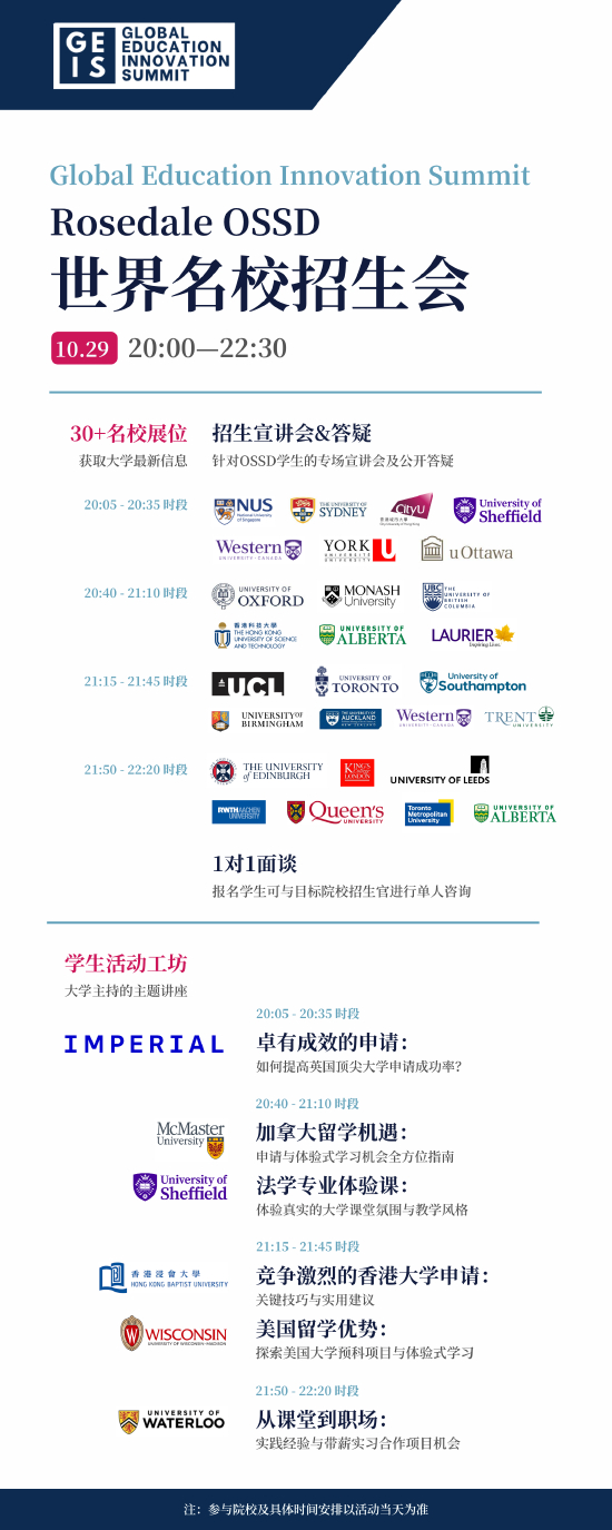 2025全球教育创新峰会聚焦AI浪潮下的教育前沿趋势,为教师与国际教育从业者提供思想碰撞;Rosedale OSSD世界名校生招生会则联动英、美、加、澳等多个国家与地区,打造升学对接平台,使学生能与世界顶尖大学招生官“面对面”交流,迈出大学申请的关键一步。