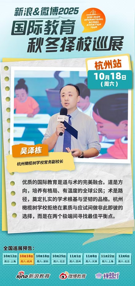 为助力杭州家庭做好国际教育规划,10月18日,由新浪教育、微博教育、择校行联合主办的“新浪&微博2025国际教育秋冬择校巡展·杭州站”如期举行。活动吸引了杭州本地老牌国际化学校、新锐学校以及诸多上海优质学校参与,充分满足了杭州家庭对国际教育的多元化需求,搭建起家长与学校之间高效沟通的桥梁。杭州橄榄树学校常务副校长吴泽栋出席本次展会并进行了主题为《浅谈国际教育的道与术》的精彩分享,以下为演讲实录: