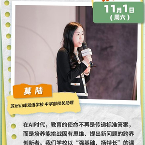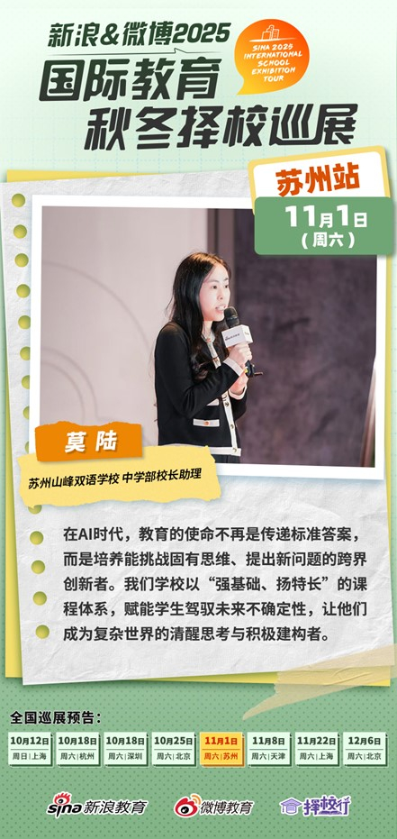 为精准回应这一核心诉求,助力苏州家庭高效规划国际教育路径,11月1日,由新浪教育、微博教育与择校行联合主办的“新浪&微博2025国际教育秋冬择校巡展·苏州站”顺利举办。活动集结了苏州本地老牌国际化学校、新锐特色校以及部分上海优质名校参展,涵盖A-level、IB、AP、DSE等主流国际课程,不仅全面匹配了苏州家庭的多元教育选择,更搭建起家长与名校之间高效直接的沟通桥梁。其中,苏州山峰双语学校中学部校长助理莫陆出席了本次展会并进行了主题为《AI时代,山峰全人教育生态的探索与实践》的精彩演讲,以下为演讲实录: