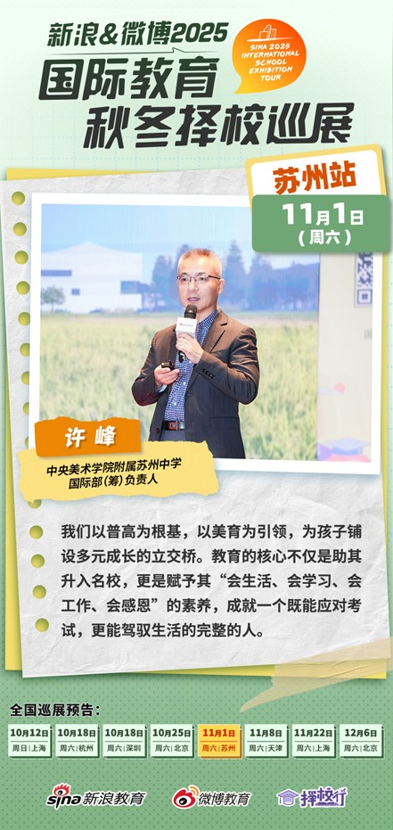 为精准回应这一核心诉求,助力苏州家庭高效规划国际教育路径,11月1日,由新浪教育、微博教育与择校行联合主办的“新浪&微博2025国际教育秋冬择校巡展·苏州站”顺利举办。活动集结了苏州本地老牌国际化学校、新锐特色校以及部分上海优质名校参展,涵盖A-level、IB、AP、DSE等主流国际课程,不仅全面匹配了苏州家庭的多元教育选择,更搭建起家长与名校之间高效直接的沟通桥梁。其中,中央美术学院附属苏州中学国际部(筹)负责人许峰出席了本次展会并进行了主题为《立足于普高课程体系的多元化升学方案》的精彩演讲,以下为演讲实录: