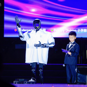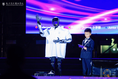 著名音乐人唐汉霄的登场,将晚会推向高潮。他与 SIA 五年级学生赵奕安、曹帏铭同台演唱《就是哪吒》与《让我留在你身边》,“我命由我不由天” 的呐喊与 “陪伴是最暖的力量” 的温柔,点燃了全场的热情,也呼应着湾外 “赋能每一个梦想” 的承诺。