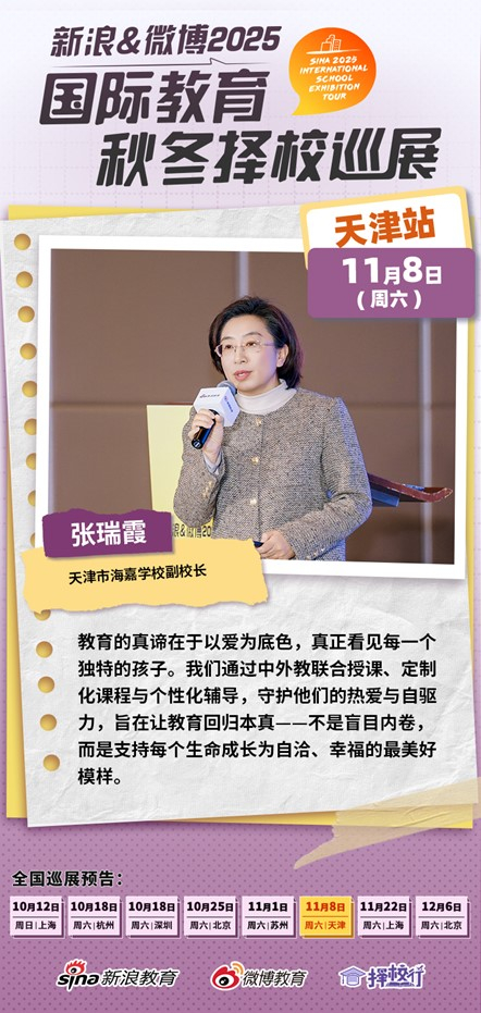 为搭建家长与名校间高效直接的沟通桥梁,精准匹配天津家庭的多元教育需求,11月8日,由新浪教育、微博教育与择校行联合主办的“新浪&微博2025国际教育秋冬择校巡展·天津站”在天津顺利举办。活动集结天津本地及周边城市优质国际教育资源,通过名校面对面咨询、教育专家分享等形式,为天津家庭带来了一场全方位、深层次的国际教育资讯盛宴。其中,天津市海嘉学校副校长张瑞霞出席了本次展会并进行了主题为《如何破解一所优质的双语学校》的精彩演讲,以下为演讲实录: