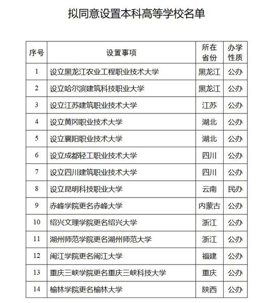 教育部:拟设14所本科高等学校