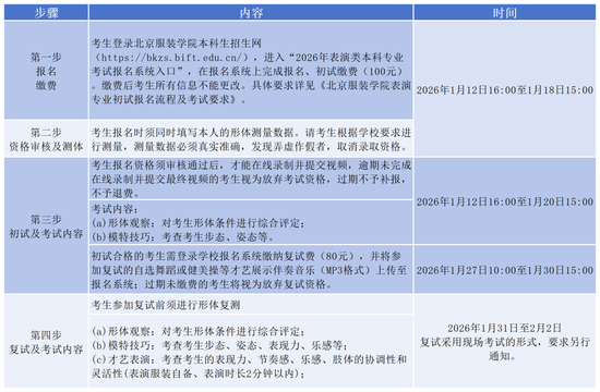 1月12日16:00至18日12:00,考生登录北京服装学院本科生招生网,进入“2026年美术与设计类考试报名入口”按要求完成线上初试报名。线上初试时间为1月22日上午。初试结果拟于2月3日左右公布。