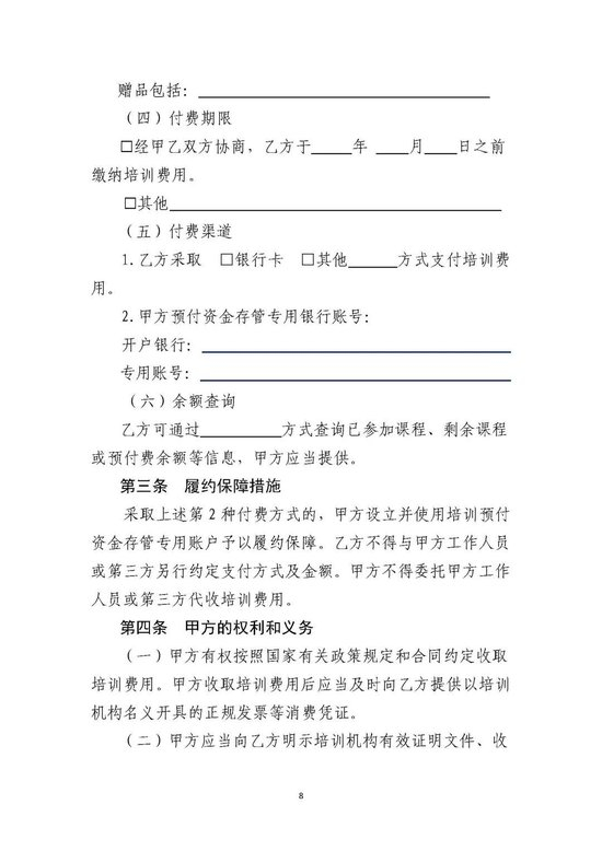 资金存管要合规:培训机构若采取预收费模式,需将全部预收资金存入专用存管账户;收费主体需与服务主体一致,不得使用存管账户以外的账户收费。切勿向个人账户或非监管账户支付培训费。