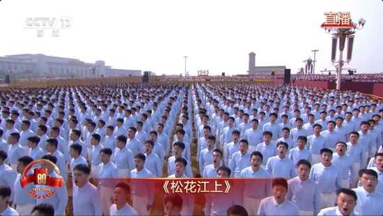“我的家在东北松花江上,那里有森林煤矿,还有那满山遍野的大豆高粱……”当《松花江上》的旋律响起,拉开了纪念中国人民抗日战争暨世界反法西斯战争胜利80周年大会暖场环节奏唱抗战曲目的序幕。