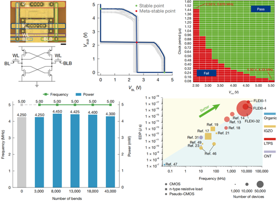 6T-SRAM柔性单元显微图、电路结构及传输特性;FLEXI-4在存算模式下的Shmoo测试;FLEXI-4经受43000次折叠测试过程中的性能监测;FLEXI系列芯片与其他柔性计算芯片的综合性能对比。