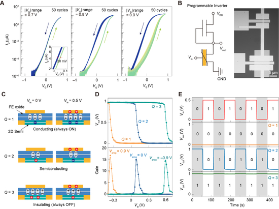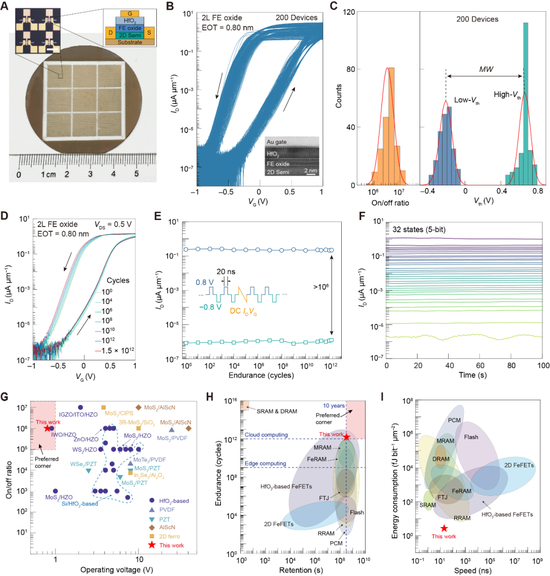 在此基础上,研究团队还制备出高性能铁电晶体管阵列,能效领先其他存储技术1至2个数量级,并展现出32个稳定多级存储态与超10年数据保持能力。尤为亮眼的是,在0.8伏超低电压和20纳秒高速写入条件下,器件经受住1.5万亿次循环考验,可靠性远超云端AI计算的严苛标准。更进一步,团队利用该器件构建出可动态重构的存内逻辑电路——在低于1伏的常规CMOS电压下,同一器件既能执行逻辑运算,又能切换为非易失存储,真正实现“一器两用”,为未来自适应智能芯片开辟了新范式。