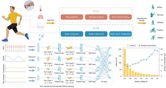 FLEXI 用于日常活动监测与分类的系统流程:数据采集、预处理、神经网络训练与片上推理;可一次性部署的四通道卷积神经网络结构;FLEXI-1不同电压条件下单次推理的延迟与能耗。