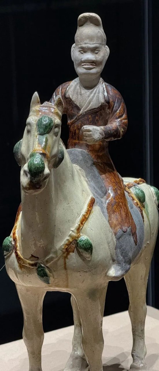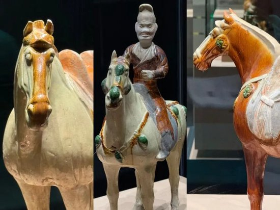 左、右为唐代三彩马;中为唐代三彩骑马俑