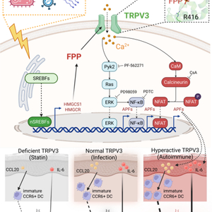 “这种物质是细胞发出的‘免疫警报素’,它会精准结合细胞上的TRPV3胞内结构域,就像钥匙打开锁一样,让钙离子进入细胞内,进而激活两条信号通路,促使细胞分泌出IL-6和CCL20两种关键物质。”团队成员介绍,这两种物质分工明确:前者能促进免疫细胞的分化,后者招募并促进树突状细胞向淋巴结移动。二者配合,能显著增强淋巴结的免疫反应,不仅让身体产生更多能对抗病原体的抗体,还能形成免疫记忆,让身体下次遇到同类病原体时快速做出反应。