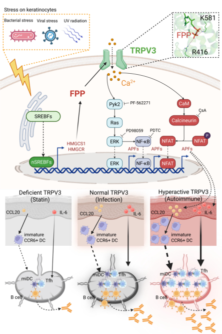 UPR–SREBFs–MVA–FPP–TRPV3–IL-6/CCL20–Tfh/GCB信号轴的示意图