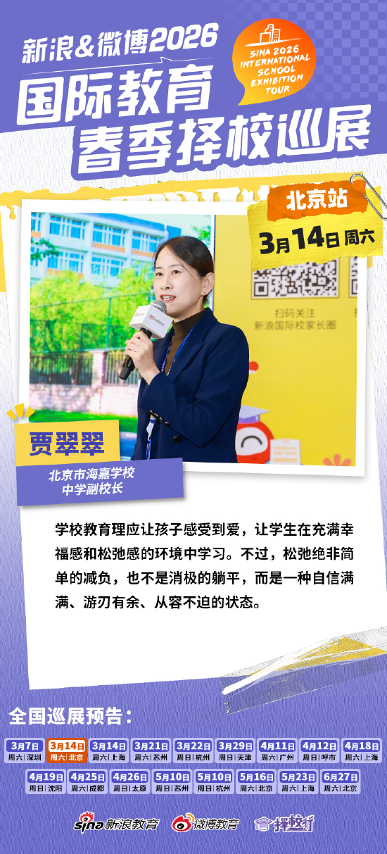 3月14日,怀揣升学规划与教育需求的北京家庭齐聚新浪微博北京国际教育择校展。现场通过教育专家的深度政策解读、学校校长与招生官的一对一答疑分享,帮助家长精准把握北京升学新趋势、新方向。活动现场,北京市海嘉学校中学副校长贾翠翠进行了主题为《爱·家·幸福的教育》的精彩演讲,具体内容如下: