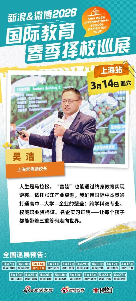为精准回应家长日益精细化、多元化的择校诉求,3月14日,由新浪教育、微博教育与择校行联合主办的“新浪&微博2026国际教育春季择校巡展上海站”首场活动启幕。本次展会全方位集结上海地区优质国际化教育资源,汇聚民办国际双语学校、公办国际部、外籍人员子女学校等多类型学校,覆盖幼儿园至高中全学段,集中展示AP、IB、A-Level等主流国际课程体系,以及日语、DSE等当下备受关注的热门课程,一站式回应家庭个性化、多元化的教育诉求。