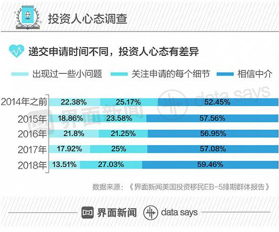 2014年及以前递交申请的受访者,对协办EB-5的服务机构信任值最低,该群体经历申请出现“小问题”的几率最大。而2018年刚申请的投资人对中介机构信任度最高,达到59%。这个群体对投资移民申请的过程也最上心,有27%的人关注申请的每个细节。