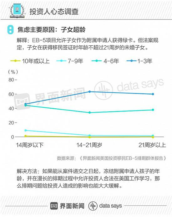 投资者的焦虑状态实际上与子女年龄相关。如果子女超龄,则无法作为家庭成员而分享绿卡福利。调查发现子女年龄在21岁以上的投资人,对申请细节关注度要明显高于其他群体,他们更期望在1-3年之内拿到绿卡。