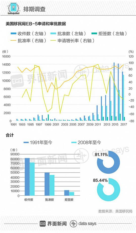 这与美国移民局公布的收件及审批数据一致。2014年,EB-5申请数量破万,并在2015年达到最高值。