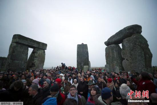 资料图:2017年12月22日,英国威尔特郡,数千民众涌向巨石阵迎接日出,庆祝冬至日的到来。