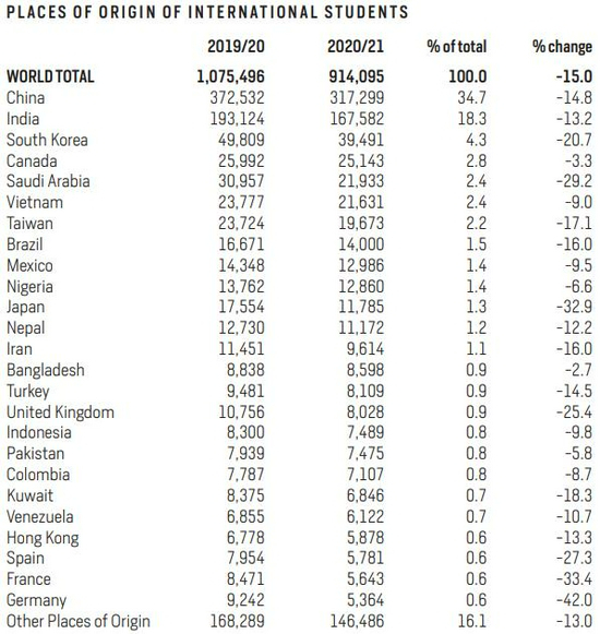 报告显示,2020至2021学年,美国大学新增国际学生数量比上一学年骤降46%,在读国际学生人数减少15%;在读的中国大陆学生人数下降14.8%,但仍然是美国国际学生的最大生源地,为317299人,占在美所有国际留学生人数的34.7%。中国连续12年成为最大国际生源国。其次是印度,留美学生人数占国际学生总数的18.3%。中国和印度两个“超级留学大国”占据了美国留学生市场的“半壁江山”。
