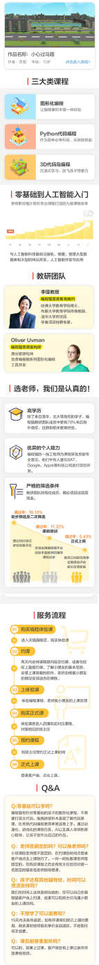 课程包含50课时图形化编程课和50课时Python编程课。图形化编程是为零基础儿童开发的,孩子通过拖拽积木了解代码背后的运转原理。Python编程课面向10-16岁孩子,是一门解释型、面向对象、带有动感语义的高级程序设计语言。