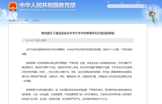 6月9日,教育部发布关于湖北省某高考考生考中作弊事件有关情况的通报: