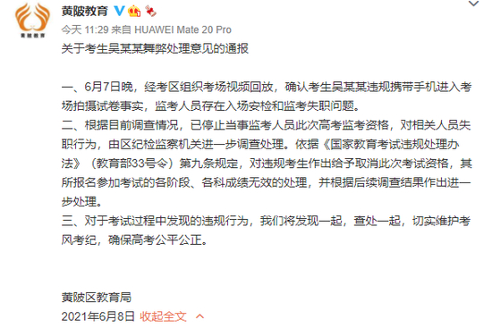 随后黄陂区教育局通报“考生拍考题上传搜题APP”:确认考生违规携带手机进入考场拍摄试卷事实,监考人员存在入场安检和监考失职问题,停止其监考资格。