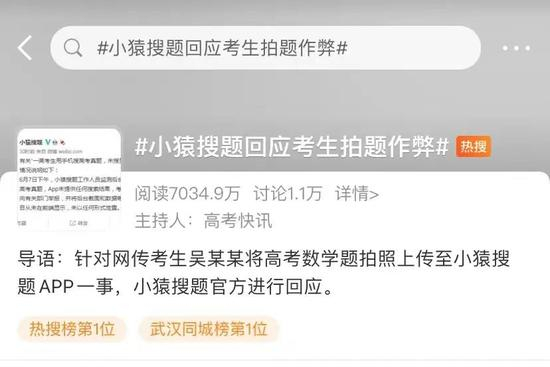 事件发生,话题#小猿搜题回应考生拍题作弊#迅速登顶热搜,全国网友及考生都在关注这类事件。
