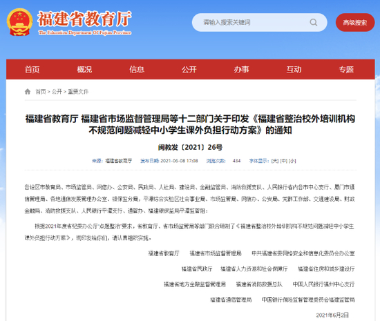 6月8日,福建省教育厅发布福建省教育厅、福建省市场监督管理局等十二部门关于印发《福建省整治校外培训机构不规范问题减轻中小学生课外负担行动方案》的通知。