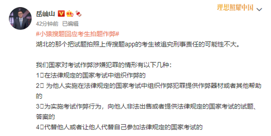 针对此次事件,北京市岳成律师事务所岳屾山律师表示该考生被追究刑事责任的可能性不大。