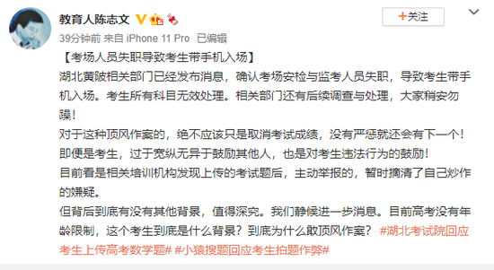 教育专家陈志文也针对此次事件发声:湖北黄陂相关部门已经发布消息,确认考场安检与监考人员失职,导致考生带手机入场。考生所有科目无效处理,相关部门还有后续调查与处理,大家稍安勿躁!