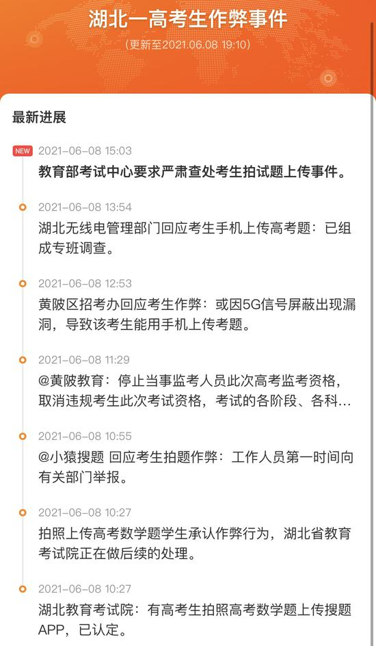 6月7日湖北省某高考考生手机作弊事件,为考生开考后用手机拍照发送考题,系考中个人作弊,不存在考前泄题。