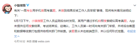 6月8日上午,@小猿搜题发出官方回应:考试结束后,经确认工作人员第一时间向有关部门举报,并将后台截图和数据等线索打包提供给相关部门供核查。该题目从未在前端显示,未以任何形式泄露。