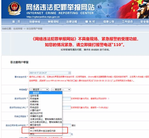 基金君查了一下,国家网络违法犯罪举报网站的确有这个选项,不过全称叫“中小学生网课中违法违规内容”。
