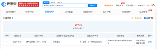 天眼查App显示,6月4日,新东方全资持股的天津新东方培训学校有限公司新增一则行政处罚,处罚结果为警告并罚款30万元,处罚事由为价格违法,决定文书号津市监执罚〔2021〕77号,处罚单位为天津市市场监管综合行政执法总队。