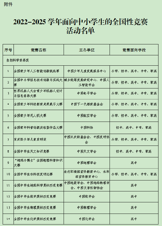 教育部办公厅8月23日发布通知,公示2022-2025学年面向中小学生的全国性竞赛活动名单。