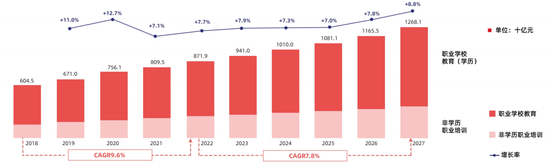 当前,职业教育进入产业中后期,存量博弈正当时,市场规模直逼万亿元。其中,学历职业教育地位显著提升,非学历职业教育走向规范化和市场化,职业教育迎来发展的黄金时代。据沙利文研究,中国职业教育市场规模由2018年的6,045亿元,增长至2022年的8,719亿元,年均复合增长率9.6%,增速明显;预计未来中国职业教育市场将于2024年突破万亿规模,并于2027年达到12,681亿元,自2022年至2027年的五年间年均复合增长率达到7.8%。