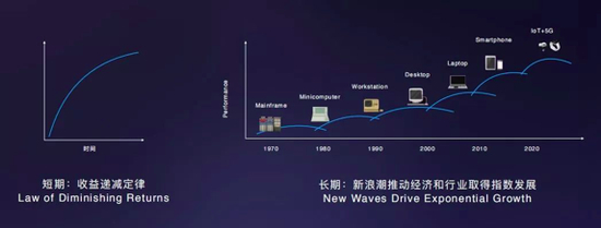 但是,读史可以知兴衰。如果你去看下信息产业的历史,你会发现同样的事情发生过很多。同样的图,从更长的时间来看,是右边这样的,叫做“新浪潮推动行业和经济实现指数发展”。每一次新浪潮内部都符合左侧的回报递减定律,但是整体信息产业,则走出了一条50年指数增长的曲线。