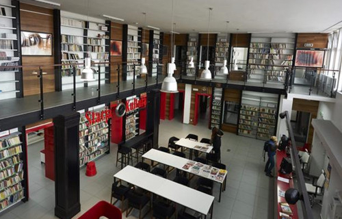 鲁米亚图书馆黑红相间的时尚细节设计,是参照火车站的老式建筑:车站和火车头的风格。而书架设计的看起来像铁路轨道。