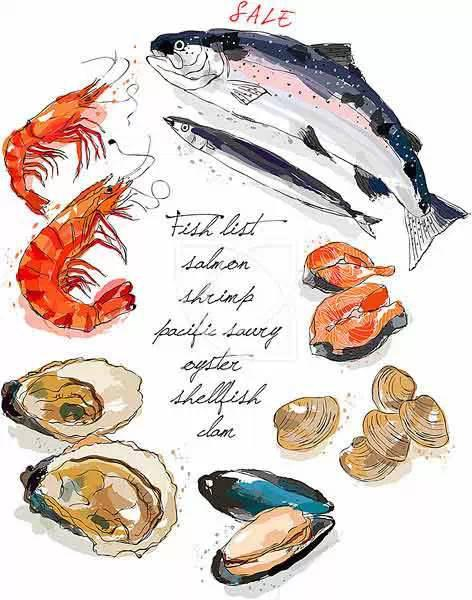海鲜类虾仁Peeled Prawns;龙虾lobster;小龙虾crayfish;蟹crab;蟹足crab claws;小虾shrimp;对虾、大虾prawn;(烤)鱿鱼(toast)squid;海参sea cucumber;扇贝scallop;鲍鱼sea-ear abalone;小贝肉cockles;牡蛎oyster;鱼鳞scale;海蜇jellyfish;鳖、海龟turtle;蚬、蛤clam;鲅鱼culter;鲳鱼butterfish;虾籽shrimp egg;鲢鱼、银鲤鱼chub silver carp;黄花鱼yellow croaker