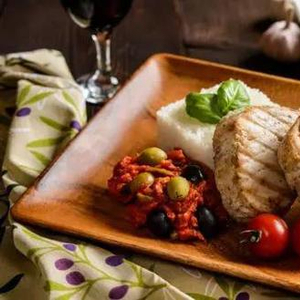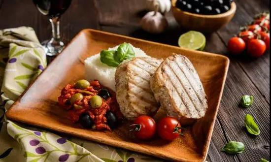 2。如汤汁或蘸料和主料是分开的,或是后浇在主菜上的,则用with连接。