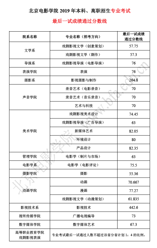附:北影2019年艺考专业考试最后一试分数线: